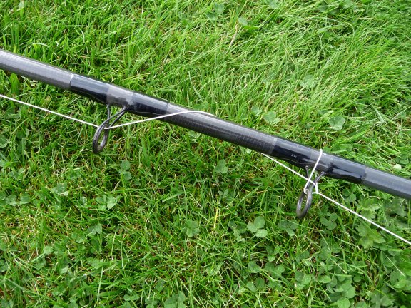 On my (60-70s) early self-built 11ft rods, when I only used fixed-spool reels, the rods were conventionally ringed. On my next (70s) self-designed/built 10ft 6in rods I had a single large butt ring (still often used fixed-spool reels) followed by 2 close-spaced rings (as previously described). On my (90s) purchased 12ft Daiwa Powermesh rods I replaced the butt ring with 2 smaller close-spaced rings. I could then pull two fingers or three fingers (see fig 7,8) of line (12-18ft) without stretching (and also whilst sitting).